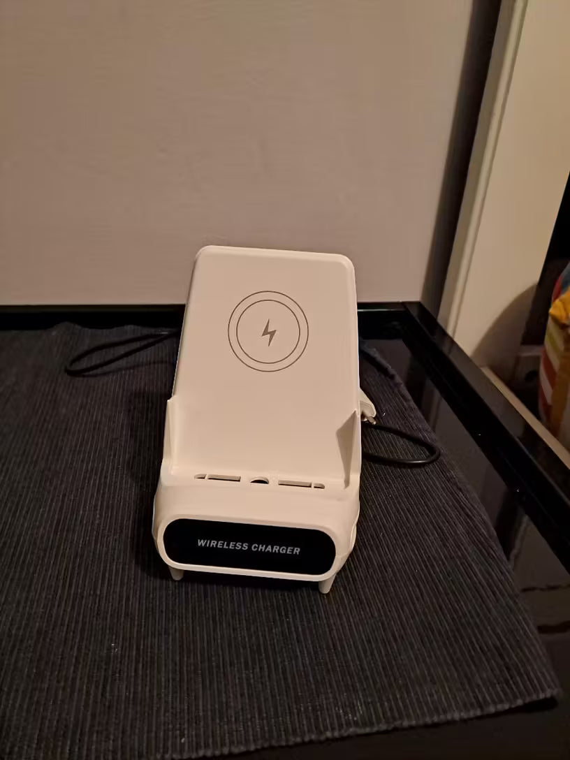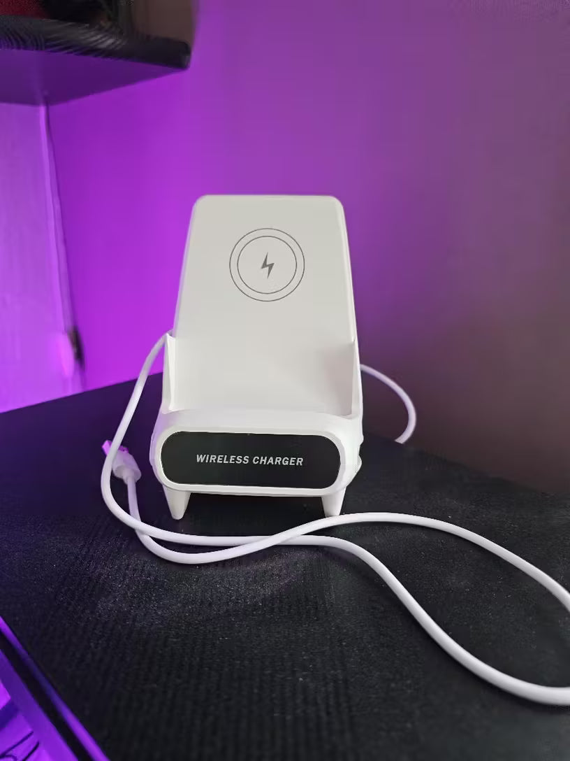 Jouw veelzijdige 2-in-1-oplader én telefoonhouder in de vorm van een stijlvolle mini-stoel. Laad je telefoon draadloos en supersnel (15 W) ⚡ terwijl je hem stevig in verticaal of horizontaal gebruik ondersteunt — ideaal voor streamen, videobellen of handsfree kijken.